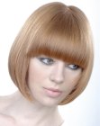 Die Haare wurden als Bob geschnitten, wobei die vorderen Seitenpartien etwas länger gelassen wurden. Der volle Pony ist zu den Seiten etwas abfallend geschnitten. Im hinteren Bereich ist eine konkave Graduation geschnitten.