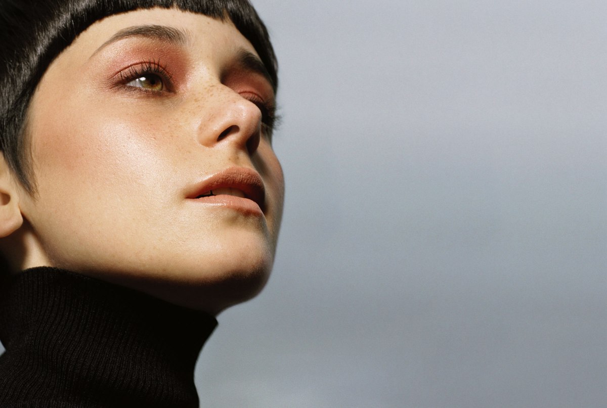Geschmeidig wie dunkles Glas, das stumpf in einen kopfumfassenden Bob geschnitten wurde und mit dem ernsten Look von Koteletten zu einer ultra modernen Herausforderung wird.