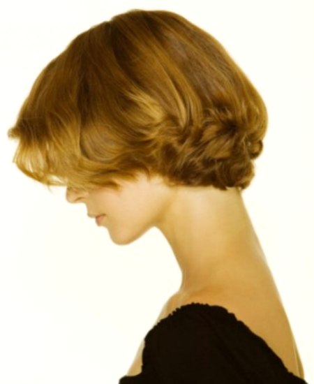 Im Nacken wurde das Haar leicht gestuft, was den Rest des Haares stützt und mehr Volumen schafft, gleichzeitig entsteht eine wunderbar volle Nackenkontur mit jugendlichem Touch. Der Pony ist lang und locken. Zum Stylen einfach föhnen, dabei mit den Fingern kneten. Mousse nicht vergessen.