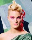 Ein traditioneller Lockenknoten auf dem Oberkopf war zu der damaligen Zeit fast Standard und die übrigen Teile des Haares wurden einer kreativen Behandlung unterzogen. Diese Streifen strahlen in lebhaften Farben, die mit Sicherheit Aufmerksamkeit erregen und wurden sorgfältig zu einem dekorativen ‚Federkleid‘ verarbeitet.