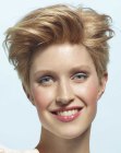 Dieser kurze Look ist überaus charmant und berührt auf beiden Seiten kaum die Ohren. Der lange Pony ist daher ein deutlicher Kontrast und wirkt wie ein lichtdurchfluteter Schleier. Viel Strukturierung und eine Bewegung nach vorne garantieren eine freche Wirkung und einen hohen Platz auf der Trendliste.